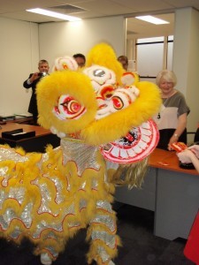 The Lion Dance (http://en.wikipedia.org/wiki/Lion_dance) gives the office Good Luck and Prosperity. The young team from Red Dragon (http://reddragon.com.au) put on a great show and were rewarded with Lai See Packets (red envelope or red packet containing a monetary gift)